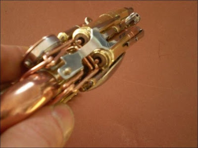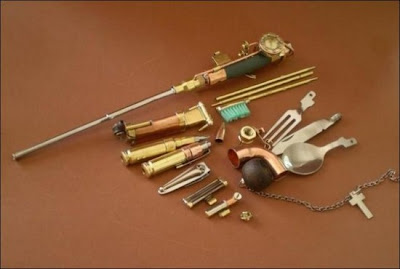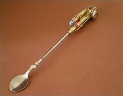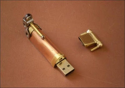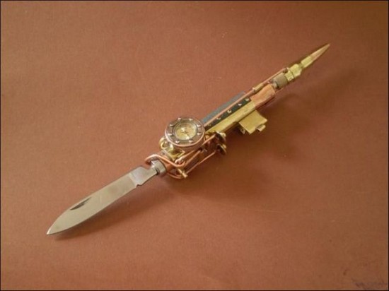 O verdadeiro nome dessa estranha peça que mais parece um canivete suiço éSteampunk Pen. Pode ser uma lanterna, uma caneta, é claro, um flash drive, uma colher, uma faca, um garfo, uma escova, um cortador de unhas, etc...